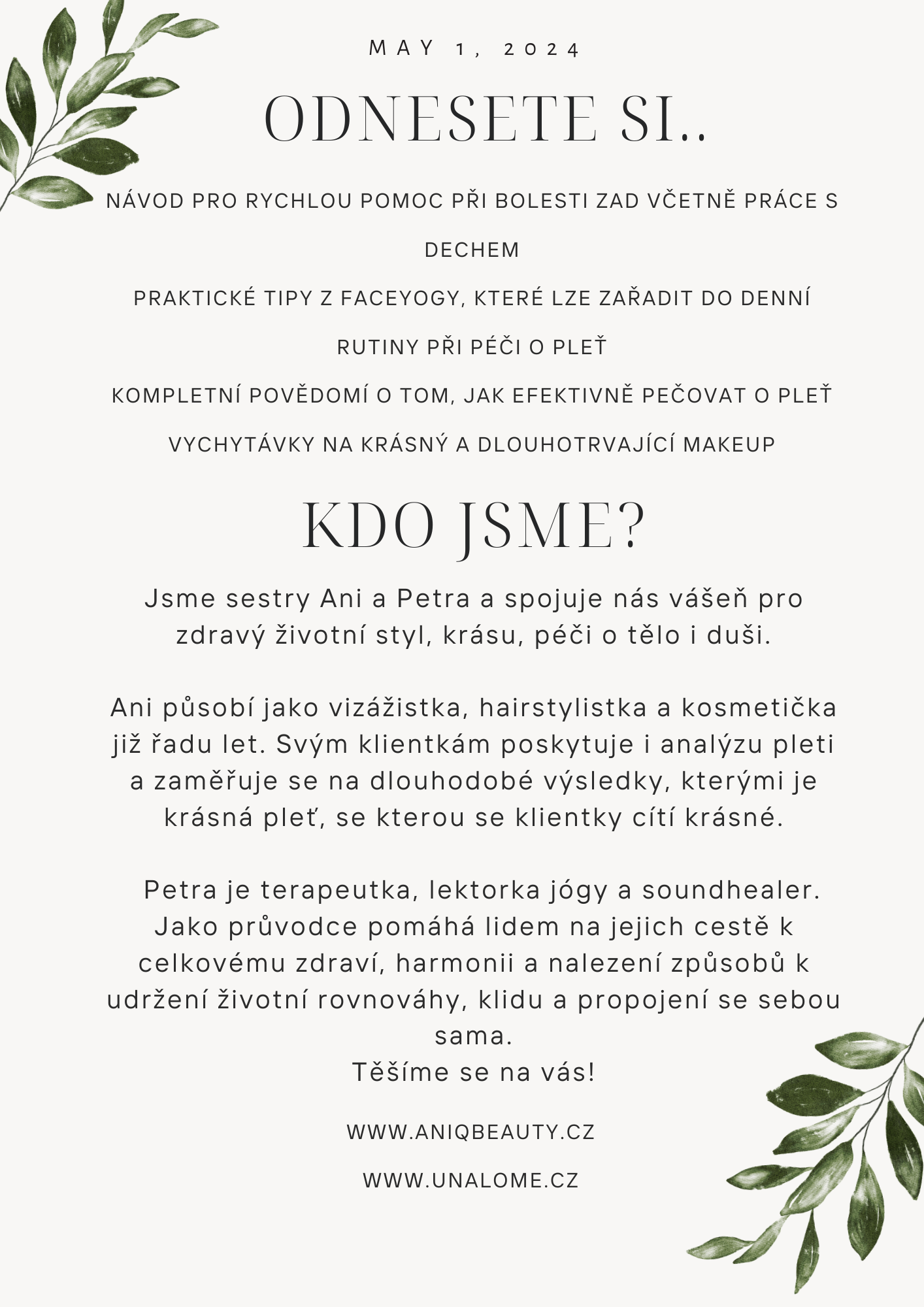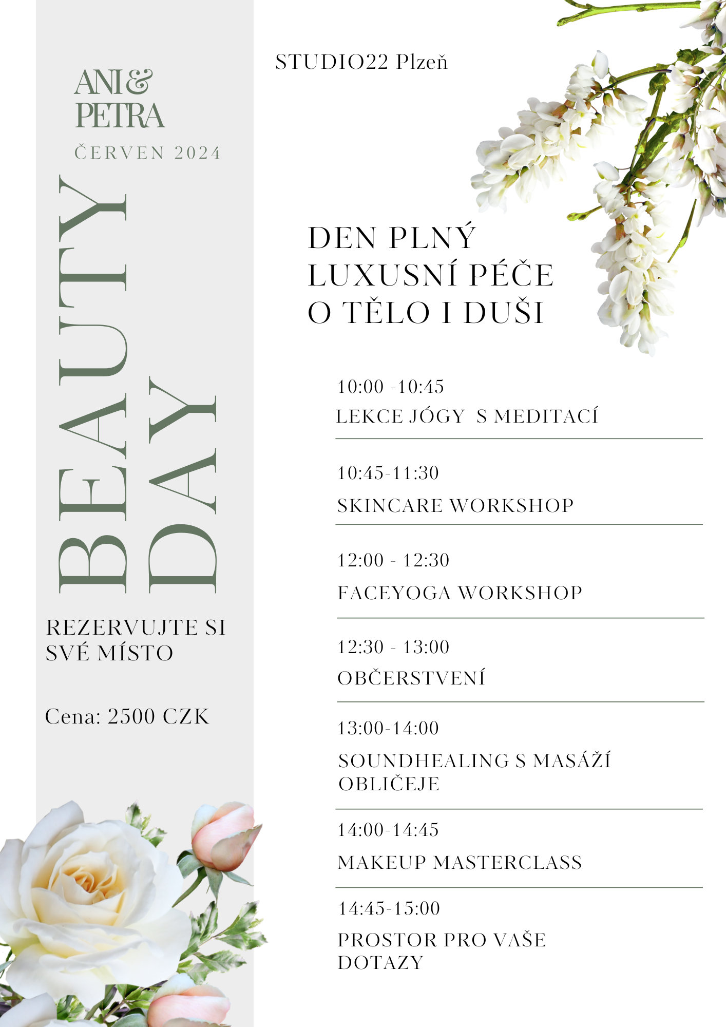 Dopřát své pleti i své duši tu nejlepší péči v jeden den? Osvojit si návyky, které pak zařadíte do své každodenní rutiny tak, abyste se cítila zharmonizovaná, uměla eliminovat stres, pomoct svým bolavým zádům a uměla opečovat svou pleť tak, aby byla hydratovaná a krásná po dalších několik let? Naučit se profesionální techniky líčení, které jsou veřejnosti dokonale utajeny?